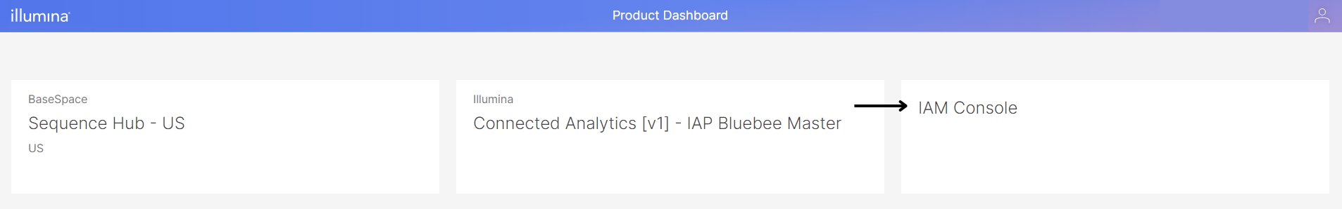 To access the Admin Console, log in through the domain login URL, and navigate to the product dashboard. From there, select "IAM Console" from the list of available applications. You can also access it directly at https://<domain>.login.illumina.com/iam