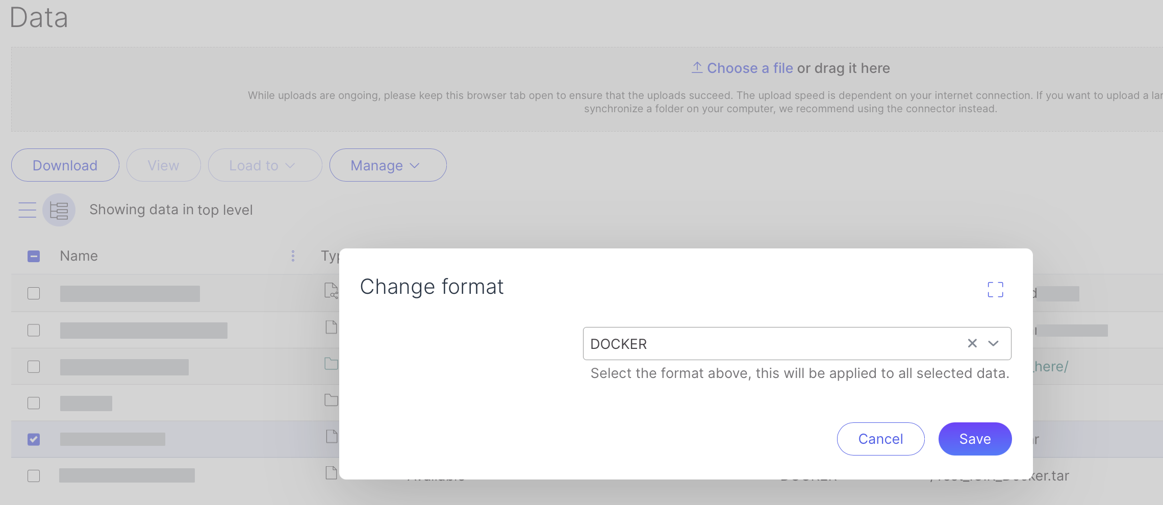 Docker image size should be kept as small as practically possible. To this end, it is best practice to compress the image. After compressing and uploading the image, select your uploaded file and click **Manage > Change Format** in the top menu to change it to Docker format so ICA can recognize the file.