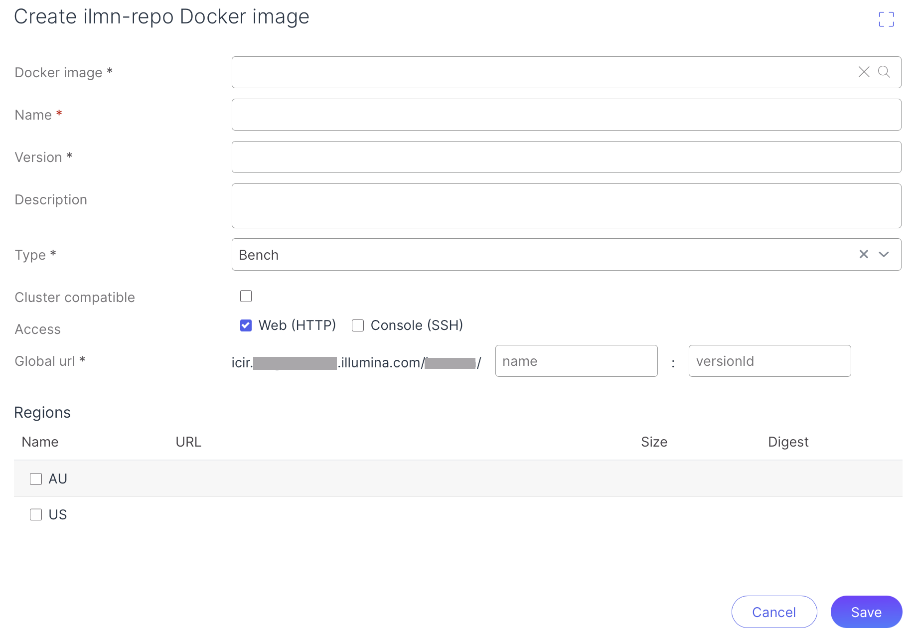 9. Select the appropriate region, determine the type (tool or bench image), the [cluster](https://help.connected.illumina.com/connected-analytics/project/p-bench/bench-workspaces) compatibility (only available for bench images), access method and click Save.
