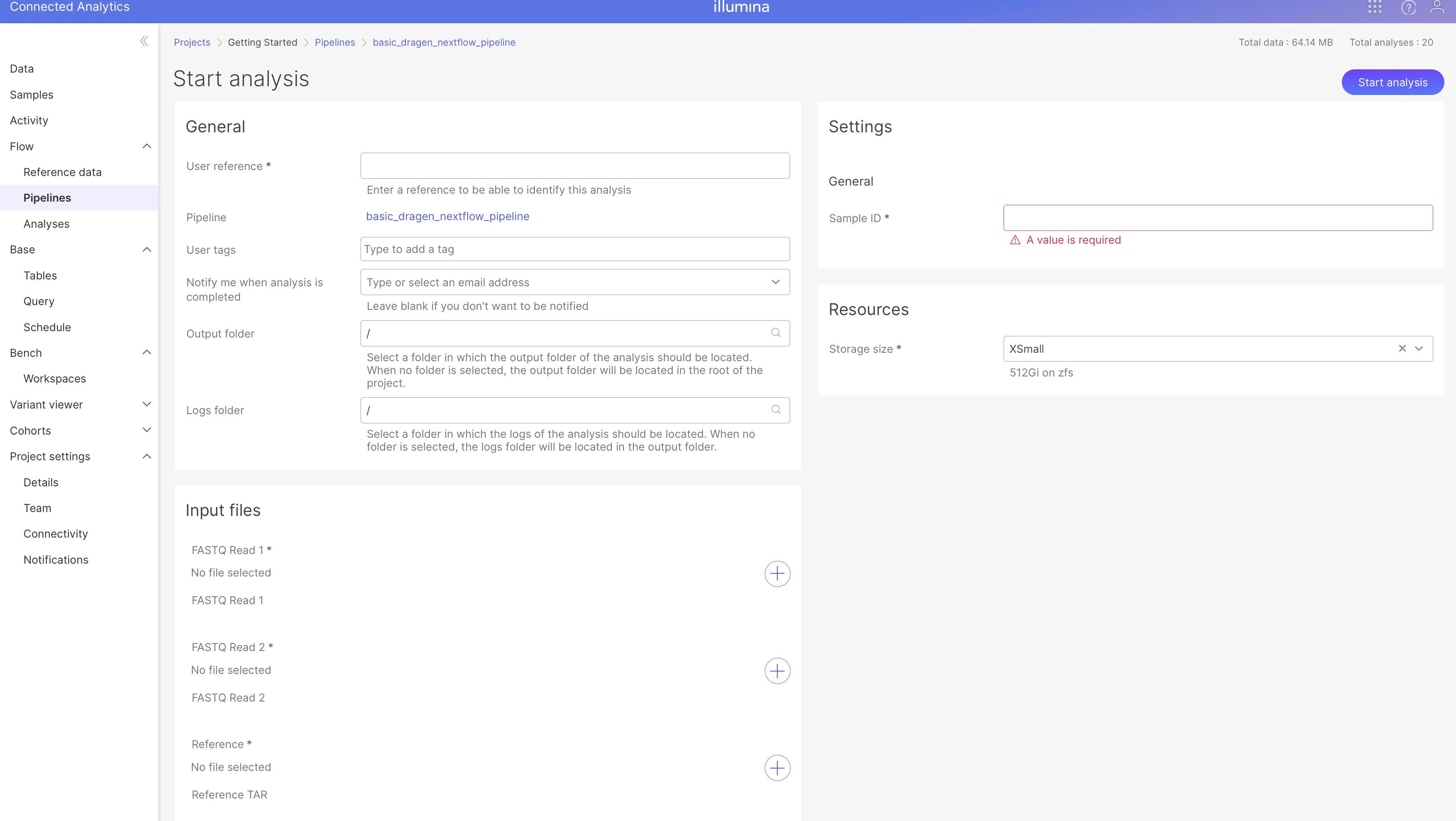 > If you have no test data available, you need to link the *Dragen Demo Bundle* to your project at **Projects > your\_project > Project Settings > Details > Linked Bundles**.
