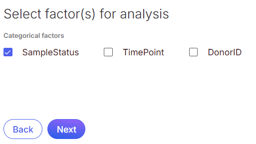 * Select 'SampleStatus', 'TimePoint', 'DonorID' then click 'Add factors'. Select 'SampleStatus' and 'TimePoint' then click on 'Add interaction' to add the factors. Click on 'Next' to set up comparisons.
