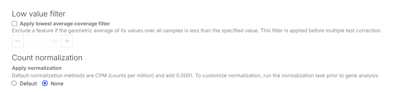 * No need to perform anymore filter or normalization, so keep the *Low value filte*r unchecked and choose **None** for *count normalization*.