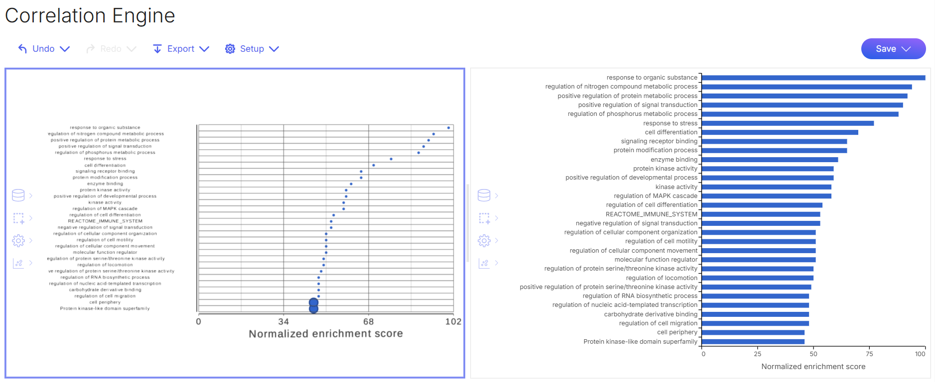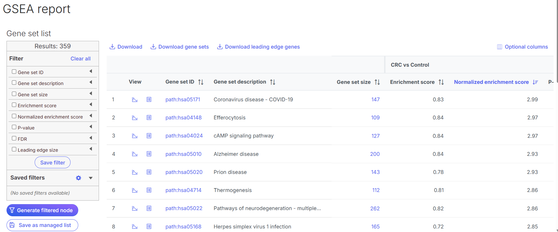 * Click on the enrichment plot icon after each row index to visualize the enrichment score of the corresponding pathway.