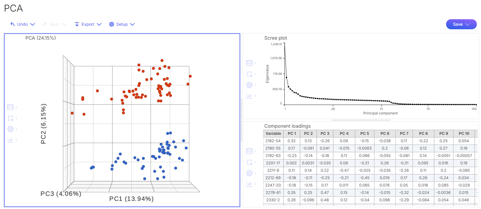 * You may also want to explore other principal components. To do this, on the left side bar for the PCA plot, choose configure, axes, and update the data for each axis.