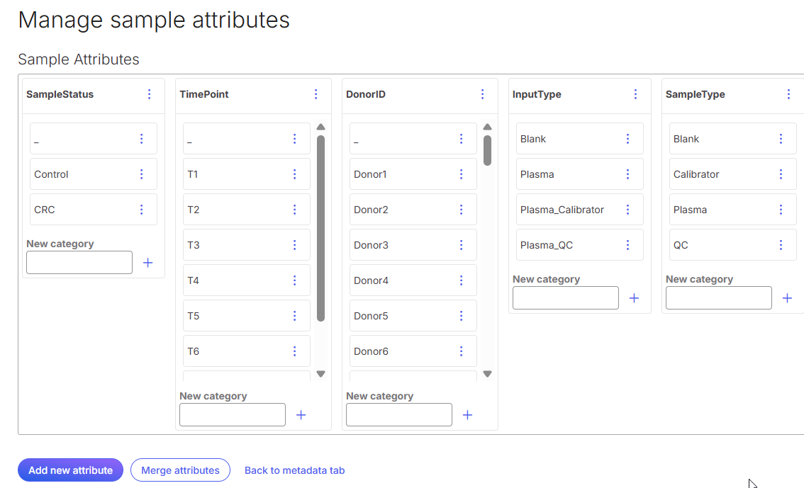* Click on '**Manage**' under 'Sample attributes' to reorder the metadata. Drag 'SampleStatus' and 'TimePoint' boxes to the front since they are the features that need to be colored for the downstream analysis. You can also add/remove/reorder other metadata or add new category to the current metadata in this page.