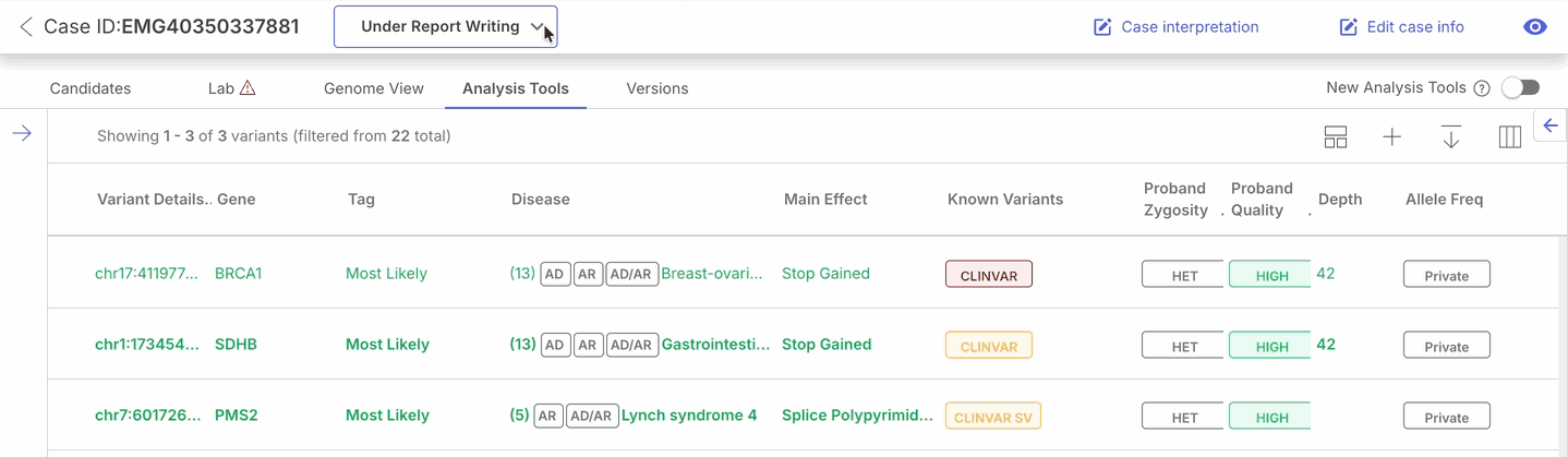 ### In the [Cases table](https://help.connected.illumina.com/emedgene/emedgene-analyze-manual/getting_around_the_platform/cases_tab/cases_table)