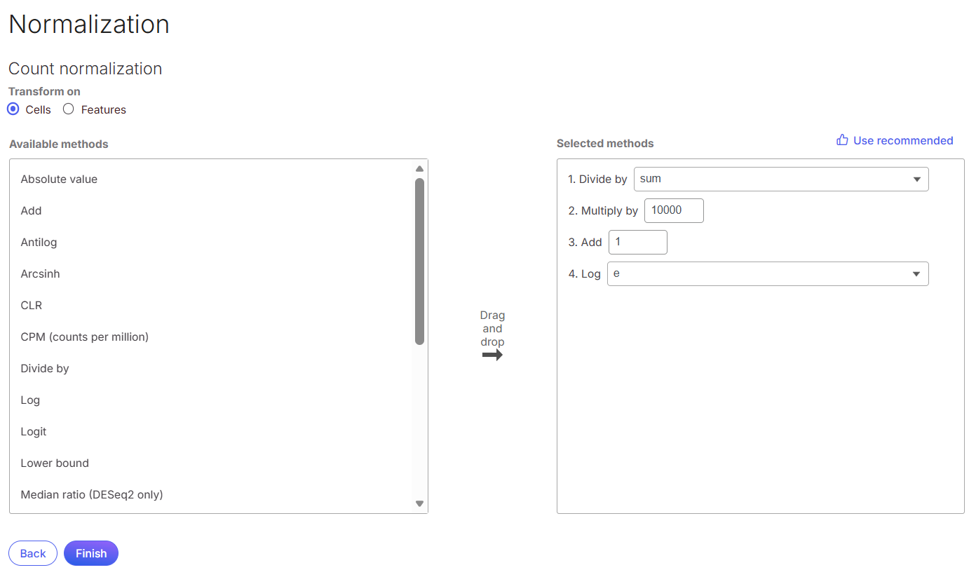 Note that each task can only perform normalization on samples or features. If you wish to perform both transformations, run two normalization tasks successively. To normalize the data, click on a method from the left panel, then drag and drop the method to the right panel. Add all normalization methods you wish to perform. Multiple methods can be added to the right panel and they will be processed in the order they are listed. You can change the order of methods by dragging each method up or down. To remove a method from the Normalization order panel, click the minus button to the right of the method. Click **Finish** when you are done choosing the normalization methods.