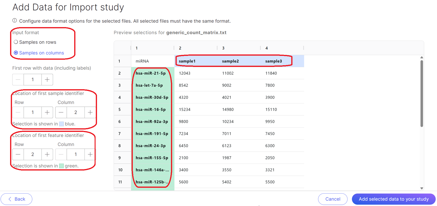 User should carefully review the file layout; sample identifiers are in blue color, while feature identifiers are in green color. If multiple files are selected, the format of the files should be the same. The order of the features can be different. All the samples and features from different files will be combined after import. If features are missing in one file, the value of the samples in this file of the missing features will be imputed as 0s.
