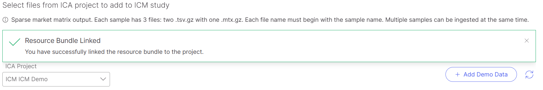 After the screen loads momentarily, a notification will be displayed that the "Resource Bundle Linked" and a new folder named "Multiomics-Demo-Data" will appear at the bottom of the page.