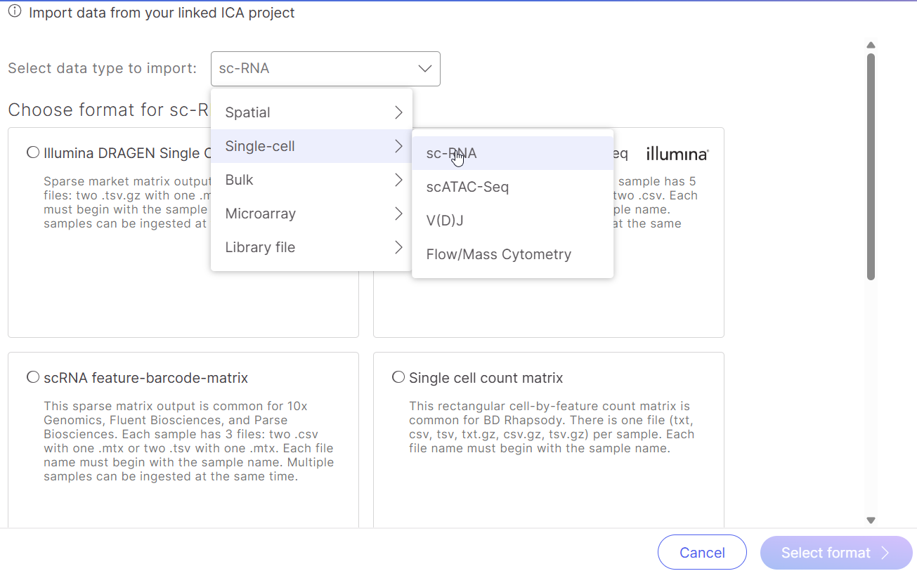From the new window, select any data type to import. For the purposes of this instruction, Single-cell > sc-RNA > Illumina DRAGEN Single Cell will be selected. Afterwards, click on "Select format" on the bottom right corner of the screen.